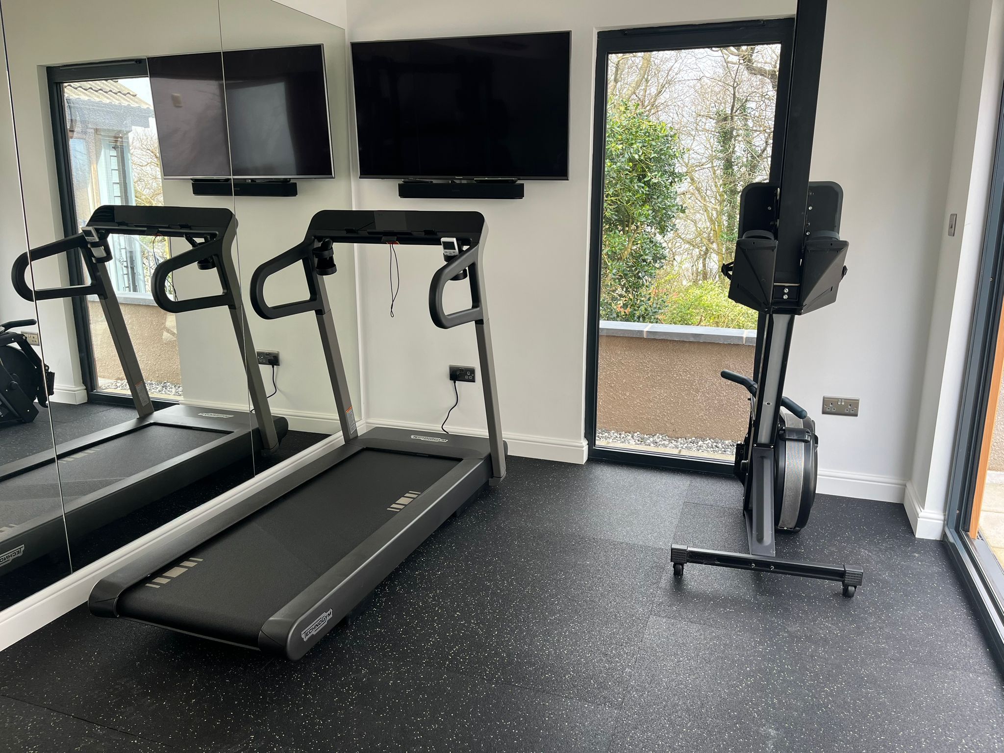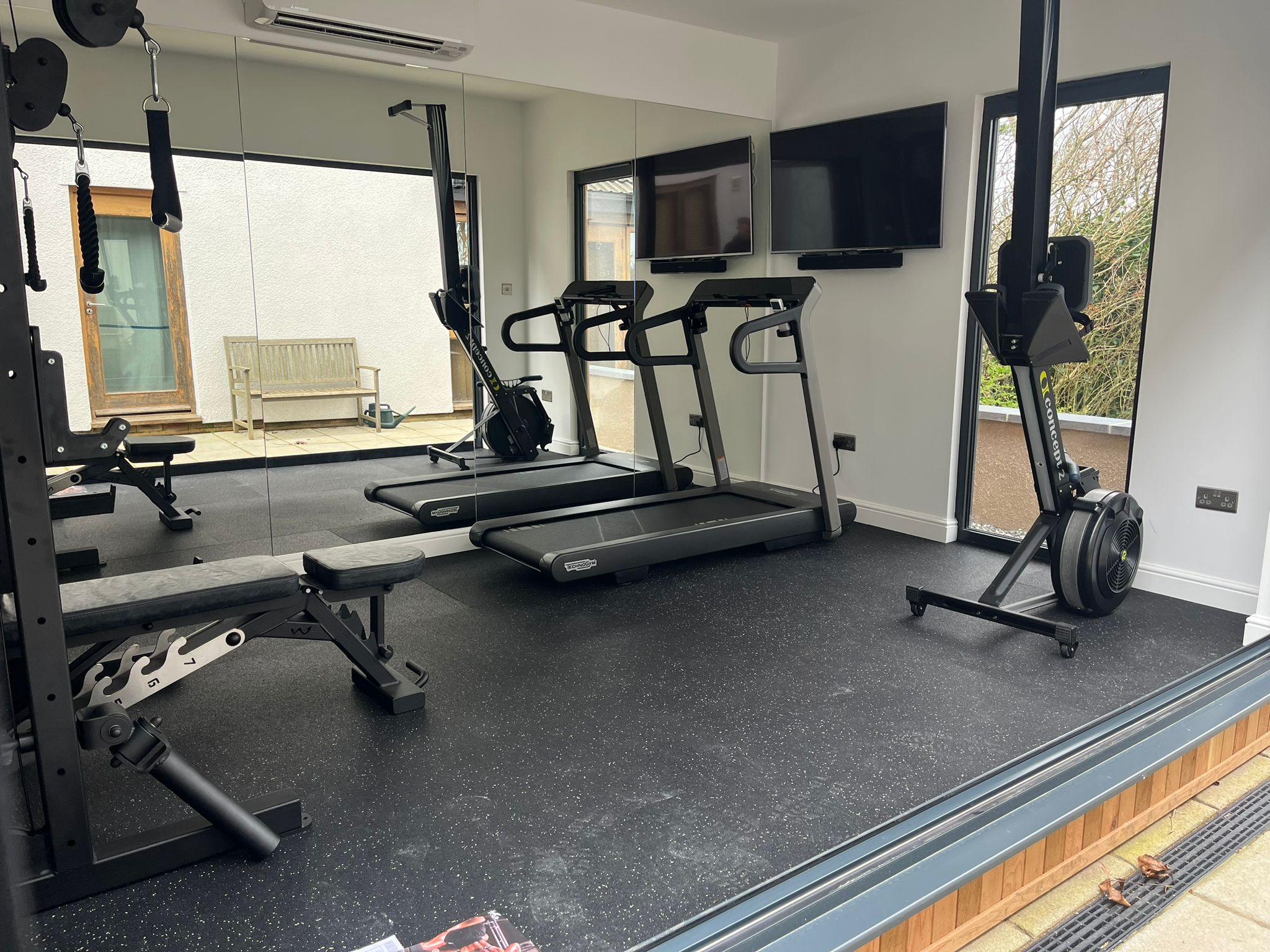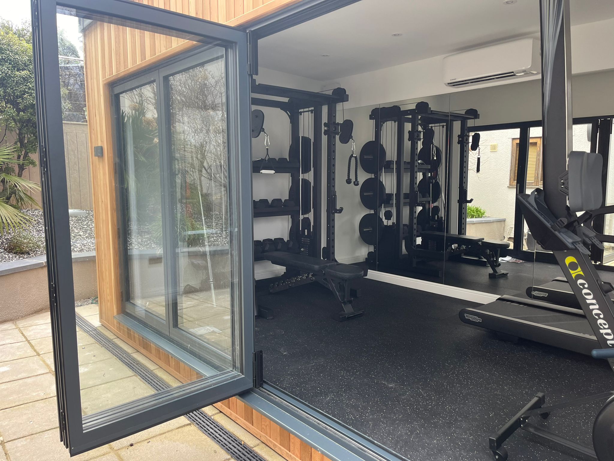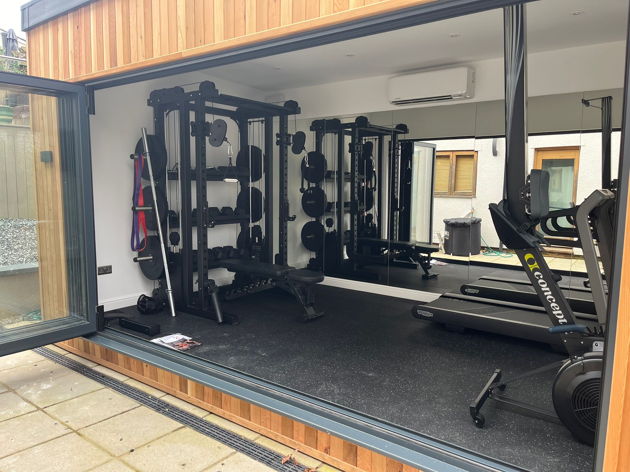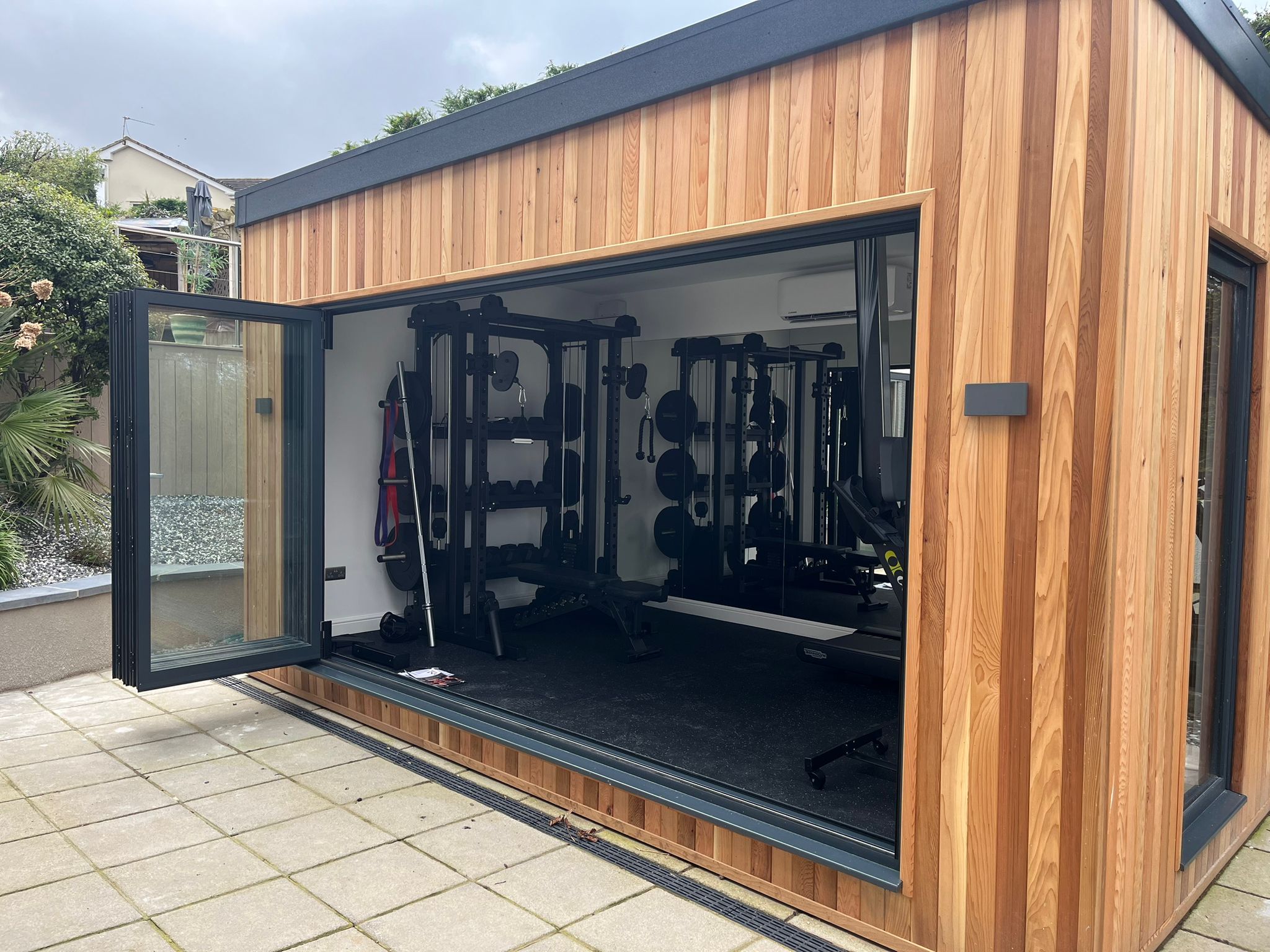 Our customer, a dedicated Personal Trainer reached out to us with a unique request: to create a garden room gym for him and his family's fitness needs. Recognising the importance of having a convenient and accessible space for exercise, he sought our expertise to bring his vision to life. We scheduled an appointment to visit him at home to discuss his requirements in detail. Our customer wanted a decent-sized contemporary studio but with a rustic charm, so we suggested to him that we use cedar wood cladding to give it the natural look that he wanted. The studio needed to be big enough to fit gym equipment and allow for workouts, so he chose a 5m x 3m size. Once this was decided, we got to work doing all of the necessary groundwork, including leveling the site, laying the concrete base, digging the trench for the underground armoured cables, as well as installing adequate drainage. We then insulated the garden studio to allow for year-round comfort and added a dual air conditioning and heating unit. Our team expertly fitted the EPDM rubber roof, and the bi-folding doors and then boarded, plastered, and painted the interior, as well as installed all electrical work and lighting fixtures. To complete the transformation, we laid the non-slip gym flooring and added the finishing touches, including mounting TVs above the running machines, providing the perfect environment for the family to stay active and healthy.
